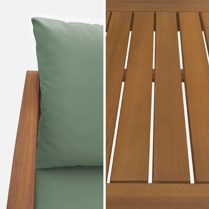 Conçu pour accueillir jusqu’à 4 personnes, cet ensemble lounge se compose d’un canapé, de deux fauteuils individuels et d’une table basse, idéal pour partager des moments conviviaux en famille ou entre amis. Sa structure en bois d’acacia issu de plantations responsables assure robustesse, durabilité et résistance aux conditions extérieures.